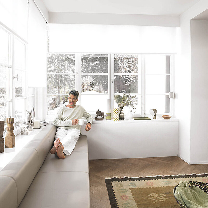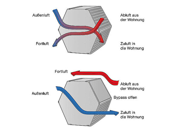Dall'esterno arriva aria fresca dentro l'edificio. Speciali filtri su richiesta evitano l'ingresso di polline e quindi impediscono le reazioni allergiche. All'interno l'aria fluisce verso l'apparecchio di ventilazione. Il sistema di distribuzione dell'aria la convoglia negli ambienti a seconda delle esigenze. Contemporaneamente il sistema fa uscire all'esterno l'aria viziata e l'umidità in eccesso.